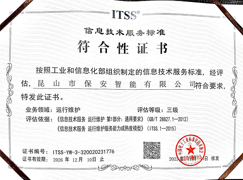 保安智能公司榮獲ITSS信息技術(shù)服務(wù)運(yùn)行維護(hù)三級(jí)資質(zhì)