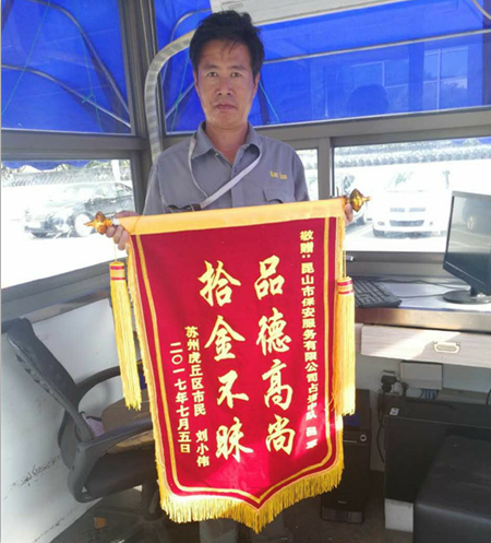 近日,保安公司停車收費中隊收到一面市民贈送的錦旗,原來是7月4日下午,停車收費員呂軍在中山路停車場巡視時,在崗?fù)じ浇鼡斓揭恢缓诎谆焐嘲?,發(fā)現(xiàn)包內(nèi)有多件電子產(chǎn)品及重要證件,隨后呂軍立即向110指揮中心報告了情況,后通過警方的幫助找到了失主,失主為了表達感激之情,特贈送了一面致謝錦旗。