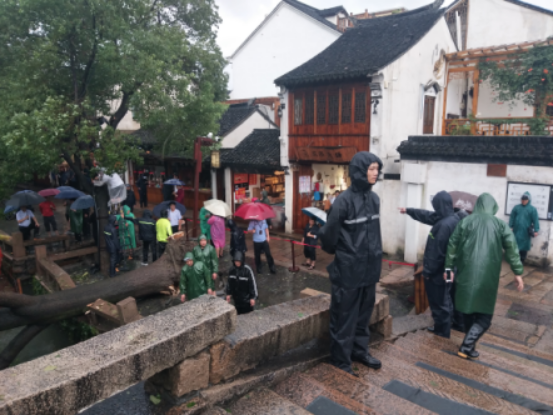 柏蘆地下停車場(chǎng)提前制定抗臺(tái)防汛應(yīng)急預(yù)案設(shè)立應(yīng)急小組,地下車庫(kù)安排2位隊(duì)員進(jìn)行24小時(shí)值班,根據(jù)技術(shù)要求,確認(rèn)防汛消防抗臺(tái)物資是否齊全,并對(duì)搶險(xiǎn)設(shè)施設(shè)備進(jìn)行檢查,排除故障隱患。亭林公園駐點(diǎn)保安保潔全力抗擊臺(tái)風(fēng),全力配合園內(nèi)各項(xiàng)防汛抗臺(tái)工作,隊(duì)員對(duì)疏通堵塞的窨井蓋和倒塌掉落的樹枝進(jìn)行清理。城管協(xié)管員、交通指揮員對(duì)路面積水嚴(yán)重路段窨井蓋進(jìn)行疏通;周莊景區(qū)隊(duì)員立即疏散游客離開危險(xiǎn)區(qū)域,并冒雨幫助沿河店鋪固定窗戶。