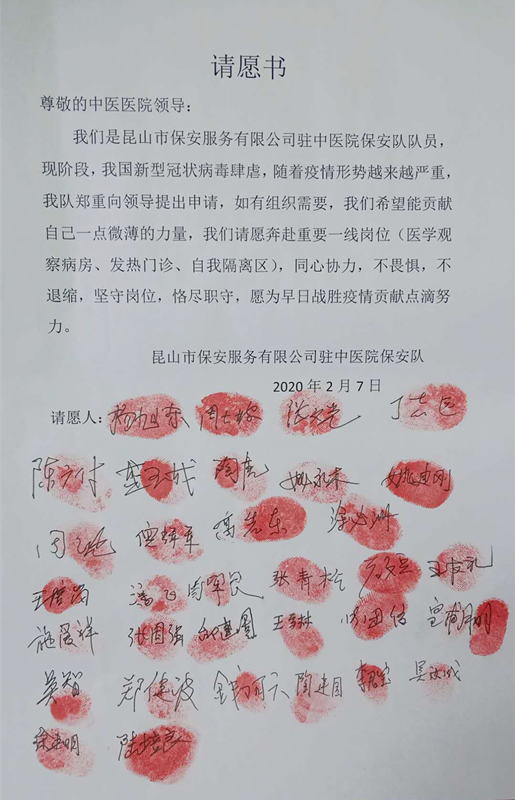 “我們請(qǐng)?jiān)副几爸匾痪€崗位(醫(yī)學(xué)觀察病房、發(fā)熱門診、自我隔離區(qū)),同心協(xié)力,不畏懼,不退縮...”。2月7日,保安公司中醫(yī)院安保隊(duì)30多名安保人員向公司遞交了請(qǐng)?jiān)笗?,志愿加入中醫(yī)院防疫重要一線安保工作。
